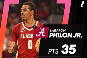 热门秀小拉巴隆·菲隆出战39分钟21投10中,三分14中6,罚球9中9空砍35分7篮板4助攻。