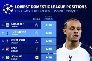 体育资讯3月10日讯 德国转会市场统计了欧冠改制以来淘汰赛球队的联赛排名,并列出联赛排名最低欧冠淘汰赛球队榜单,本赛季热刺排名仅高于2016-2017赛季的莱斯特城。
