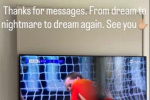 今日金斯基在风波后首次更新社媒,他的配图正是电视上自己失误懊悔的瞬间。此外他写道:“谢谢大家的信息。从梦想,到噩梦,再到梦想。大家再会。✋”
