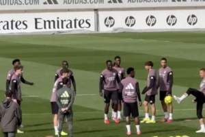 体育资讯3月6日讯 北京时间明天凌晨4时,西甲第27轮皇马将在客场对战塞尔塔。赛前记者Miguel Angel Diaz在社媒晒出皇马赛前训练的照片,此前因牙疼缺阵的卡马文加出现在训练场上。